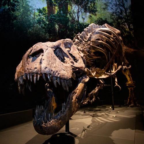 T. rex Trix. Lag 66 miljoen jaar onder de zoden. Werd opgegraven, in kratten gepakt en naar Leiden verscheept. Heeft daar nooit om gevraagd. Trekt nu bekijks in Naturalis. Daar op de foto gezet door Sobriquet, want die hebben een houten dino als mascotte. Maar je raadt het al: Trix vroegen ze niks. Kan daarmee leven.